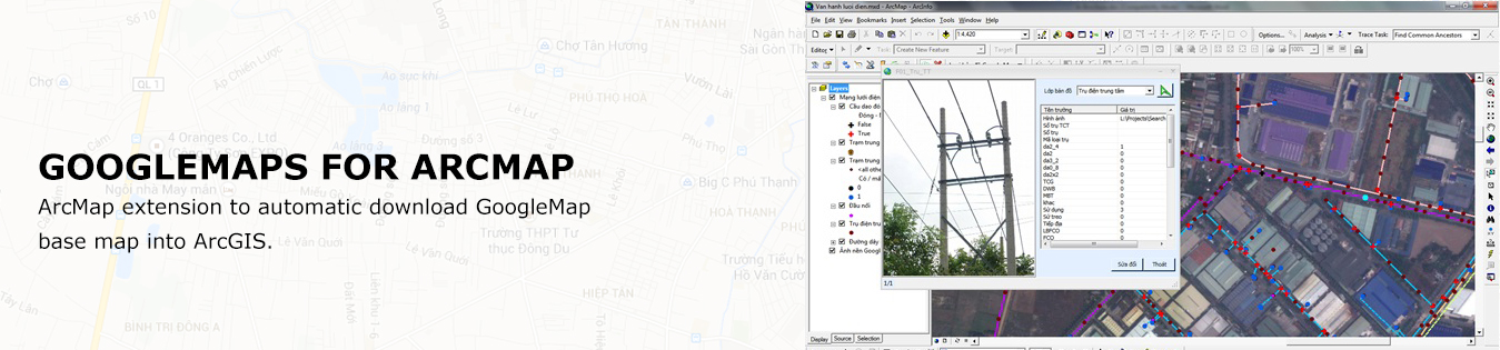 Công cụ này giúp cho việc tự động tải ảnh bản đồ Google Maps về khung hình bản đồ trên cửa sổ hiển thị bản đồ ArcGIS giúp cho việc tham khảo thông tin bản đồ nền Google Maps so với nền bản đồ hiện tại trong ArcGIS.